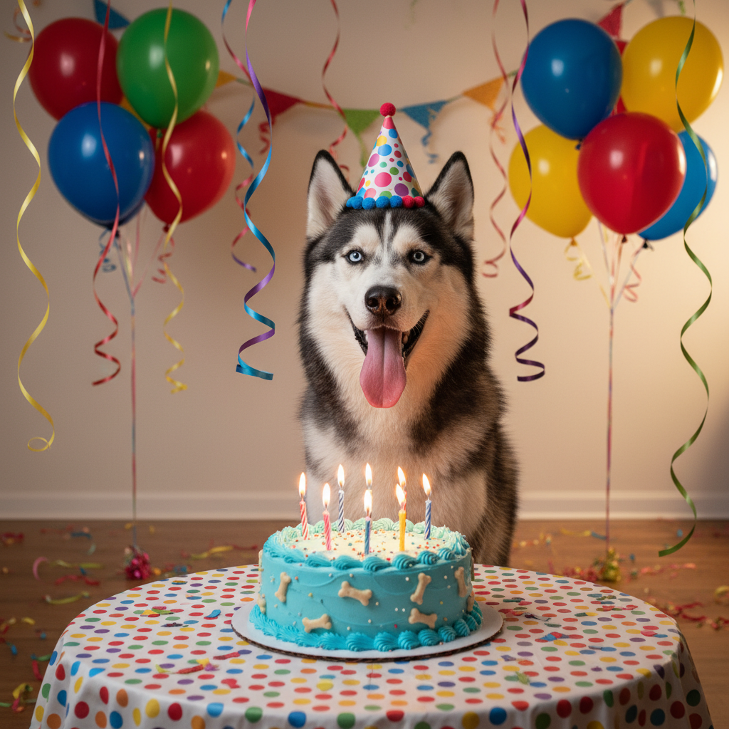 Upload a photo of your Husky and watch as our AI transforms it into a stunningbirthday masterpiece. Ready in seconds!